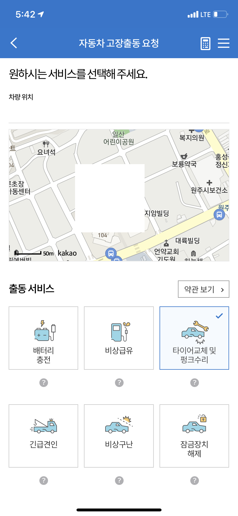 이번엔 어떤 출동서비스를 원하는지 선택하게 나왔습니다.