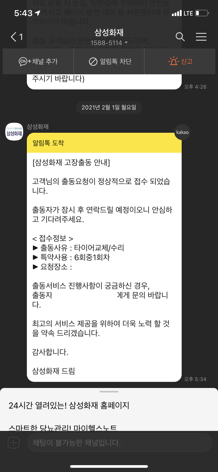 약관을 생각해보니 연 6회까지 긴급출동 애니카 서비스라는 것을 받을 수 있었습니다.
