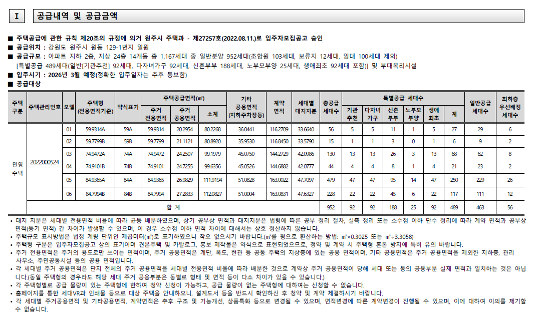 - * 공급세대수는 사업주체의 최초 입주자모집 공고문 기준입니다. 특별공급 신청 미달 시 잔여물량은 일반공급으로 전환됨에따라 일반공급 세대 수가 변경될 수 있으므로 최종 일반공급 세대수는 일반공급 신청일에 '청약접수 경쟁률'에서 확인 또는 사업주체에 문의하시기 바랍니다.